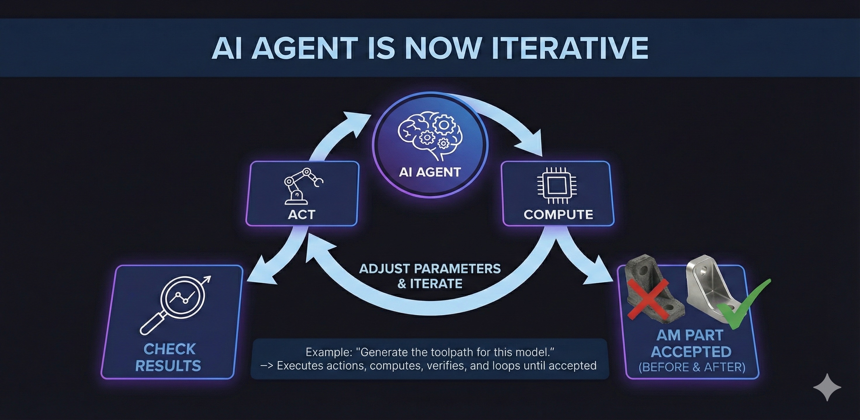The AI Agent can now execute a feedback loop from a single prompt like “Generate the toolpath for this model.” It performs actions, computes results, checks outputs, and iterates back to adjust settings until the final result is accepted by the agent.